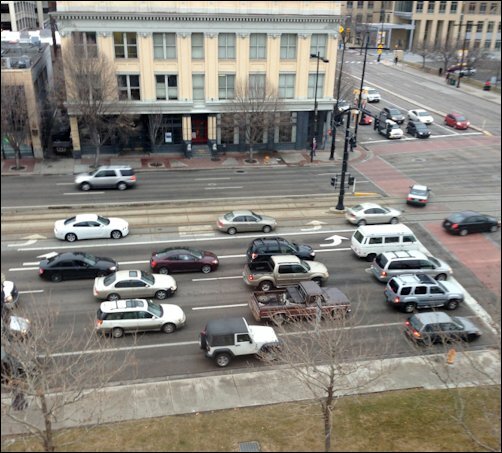 The street in the picture below is 400 South in downtown Salt Lake City. In general, it’s a massive and massively unpleasant street: